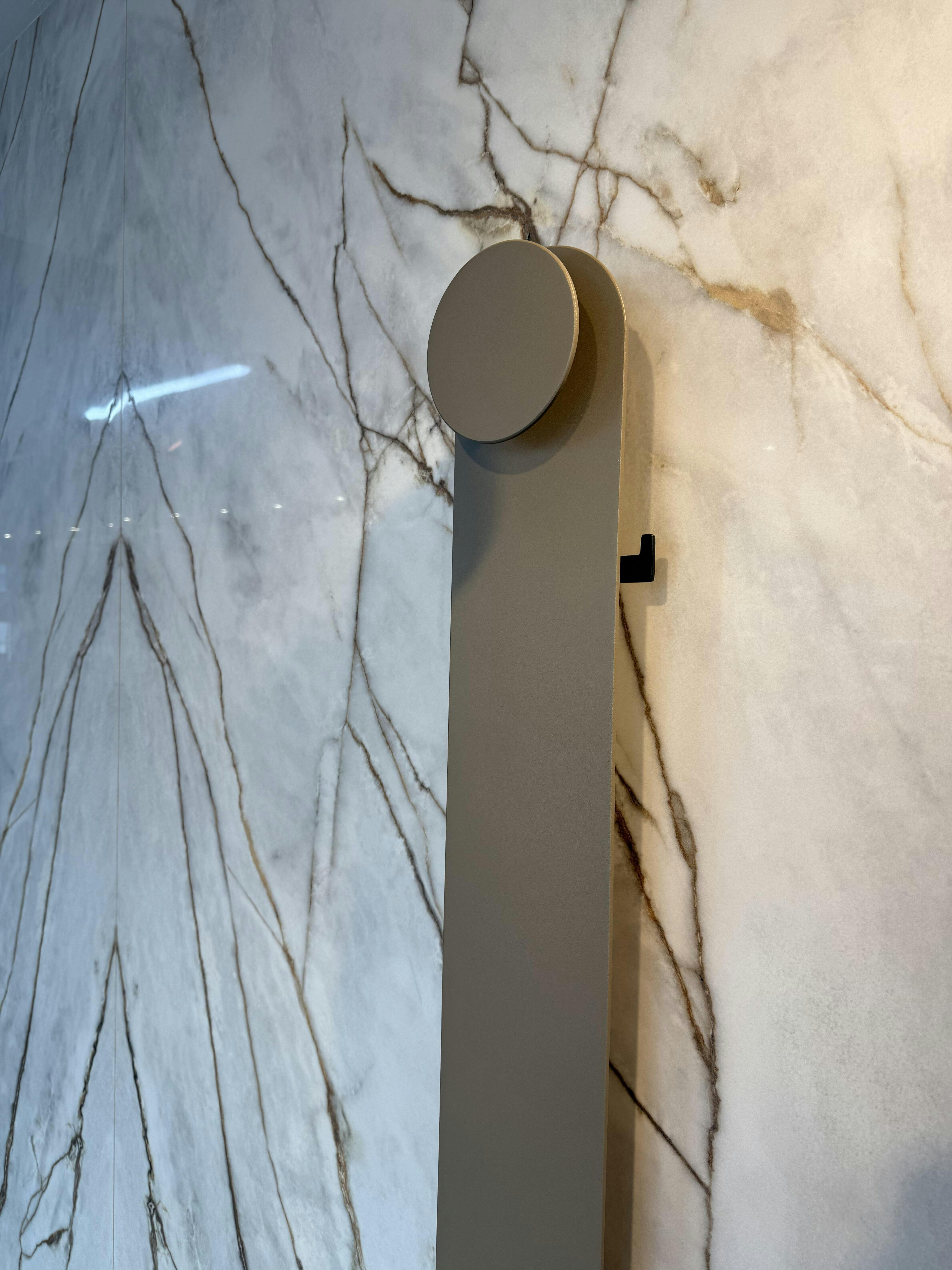 Multifunctioneel designelement in mat aluminium als handdoekhouder of kledinghanger.
