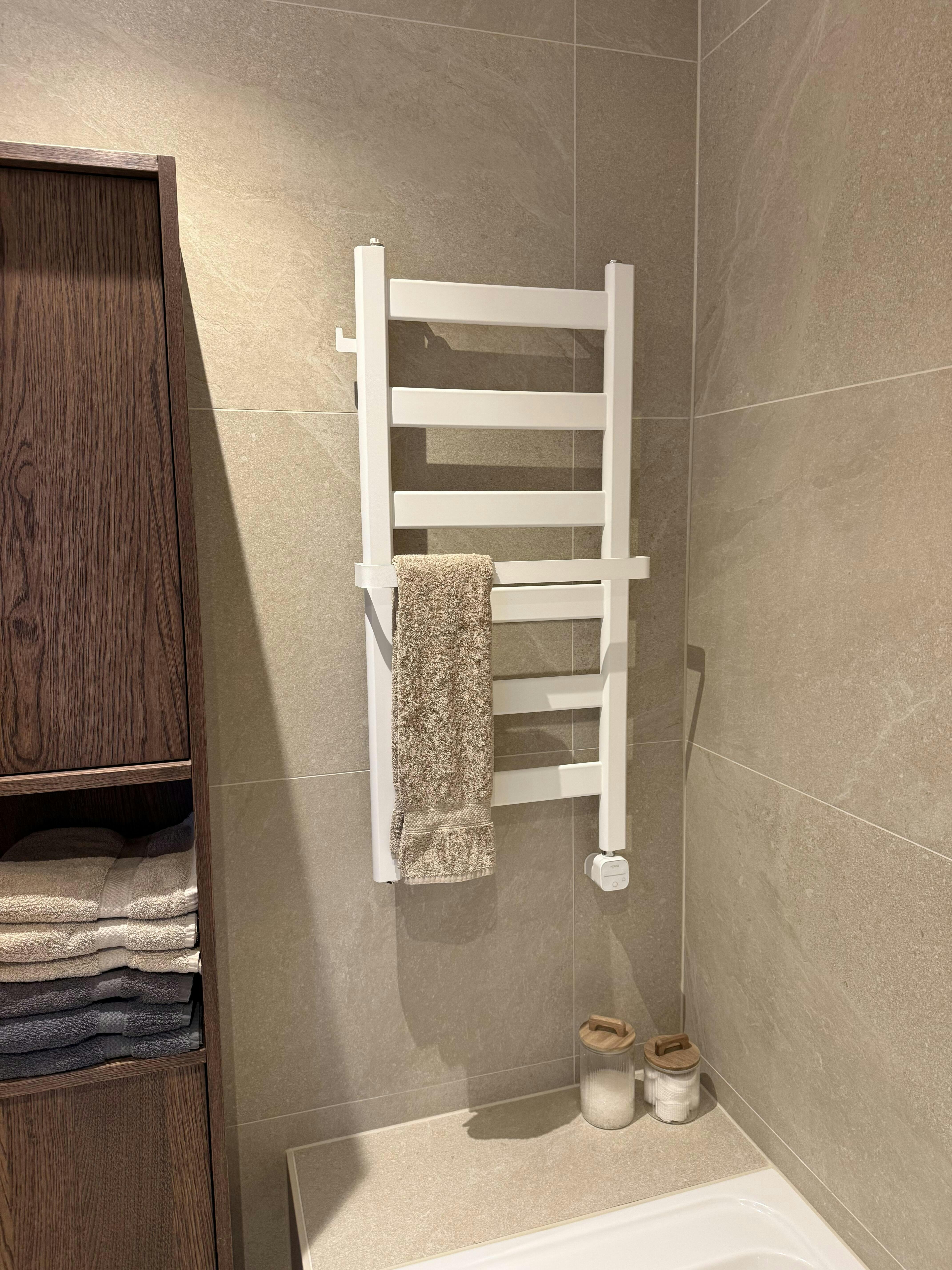 De radiator biedt een handige plek om handdoeken op te hangen en te drogen, zodat ze droog en klaar voor gebruik zijn, zonder problemen met schimmel of vocht die kunnen optreden bij vloerverwarming.